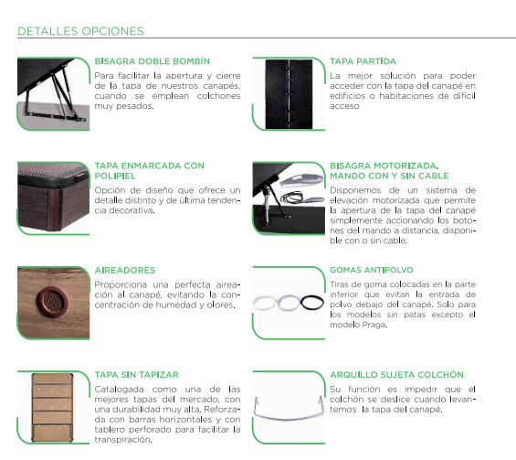 – Tablero de 10mm. multiperforado fijado al marco mediante clavos de acero estriados. Tapizados con tejido de malla transpirable con base de fibra compactada.
